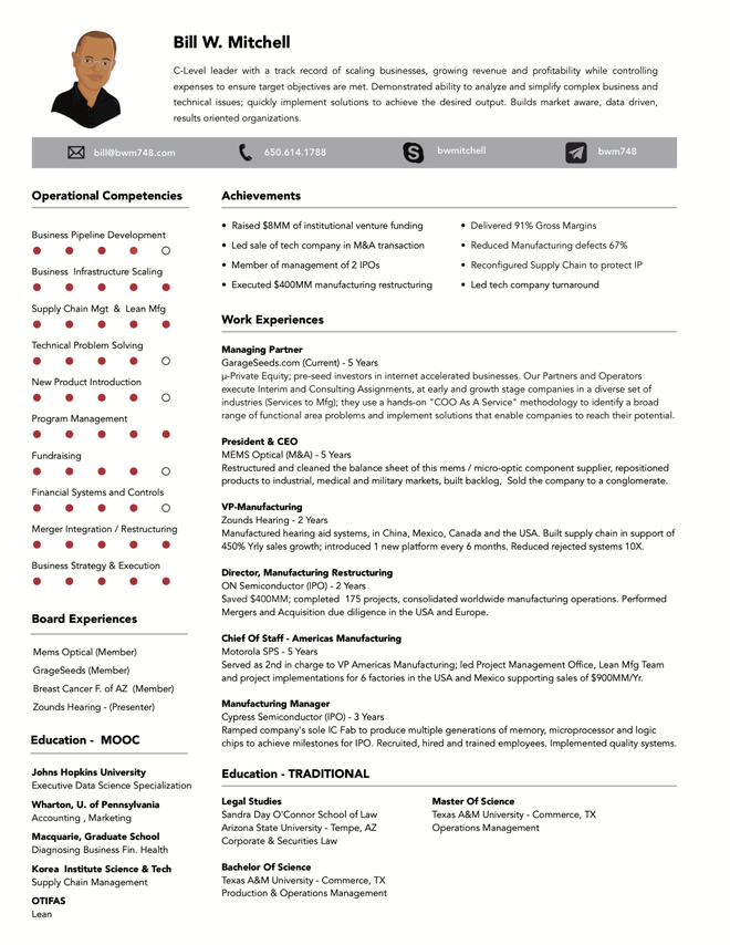 Bill, is a well known and respected senior executive with more than 30 years experience in high technology dealmaking, manufacturing, retailing and leveraging the internet to drive profitable growth.The first half of his career was spent building classic management skills; technology, R&D, manufacturing, supply chain and accounting with the 2nd half devoted to helping companies manage through high change environments, from Venture Capital backed startups like Mems Optical to multi-billion dollar Private Equity funded businesses like ON Semiconductor.